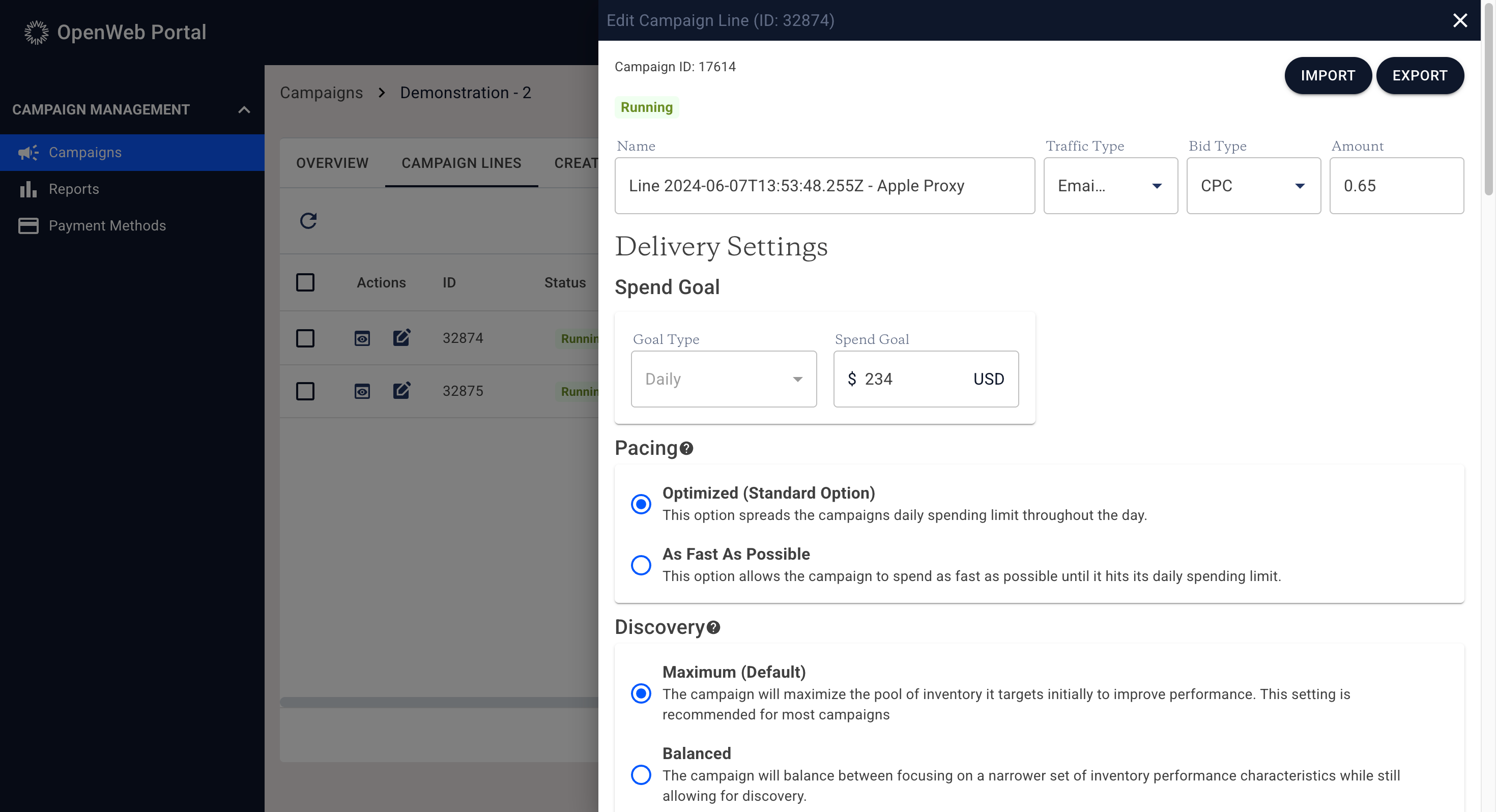 Campaign line configurations can be exported and reused.