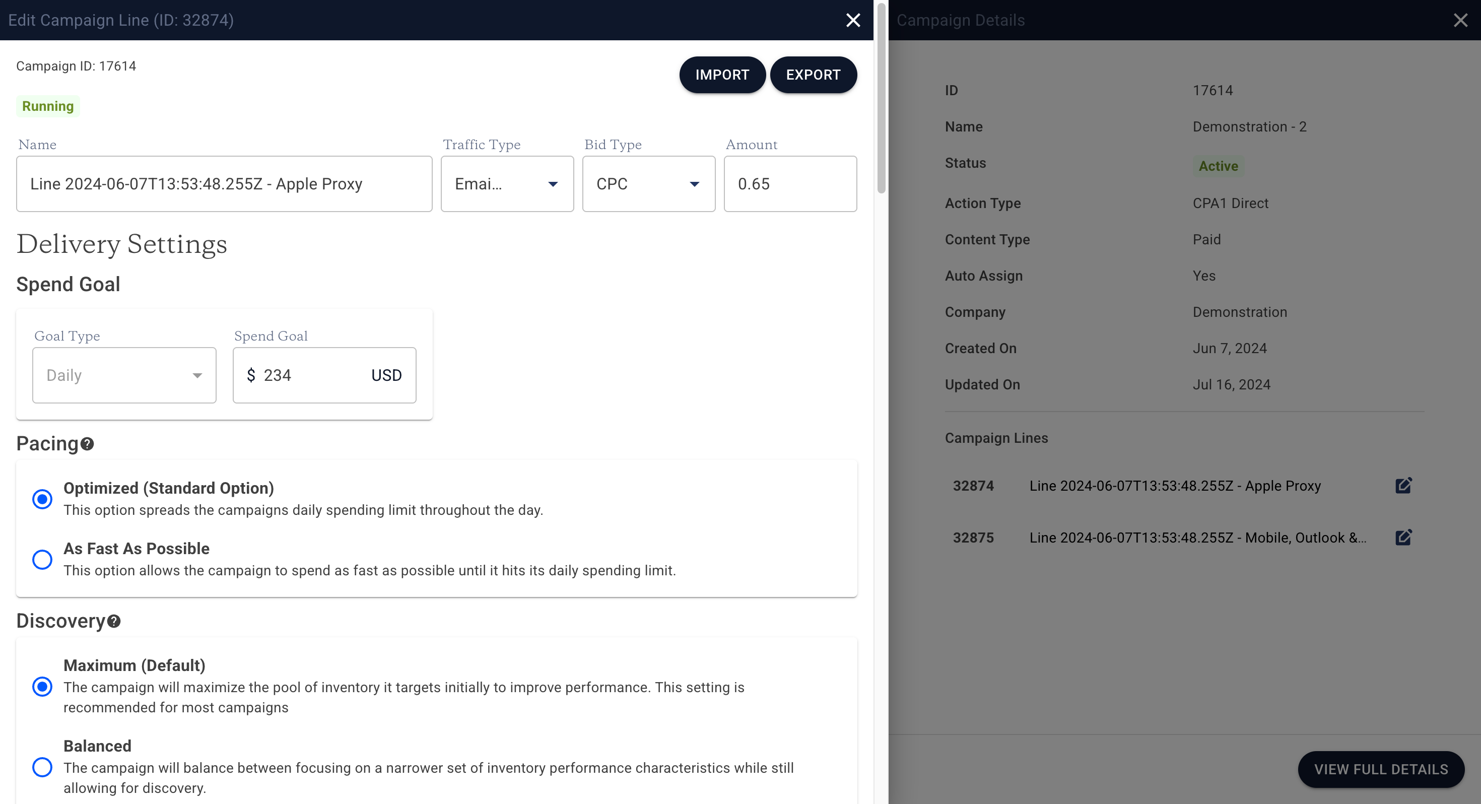 Selecting a campaign line opens a secondary slide-out panel containing the full configuration settings for that line. Depending on user permissions, editable fields may include: